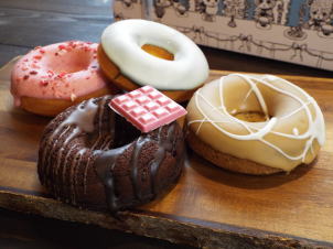 木苺の風味がほのかに香る生地にホワイトとスイート二種類のチョコをかけた甘酸っぱいドーナツです。