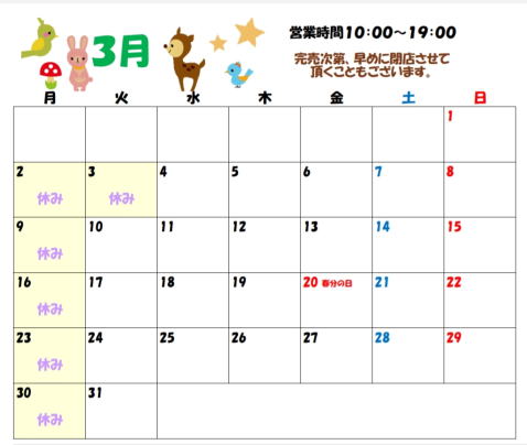2026年3月1日3月の新商品情報、定休日のお知らせ